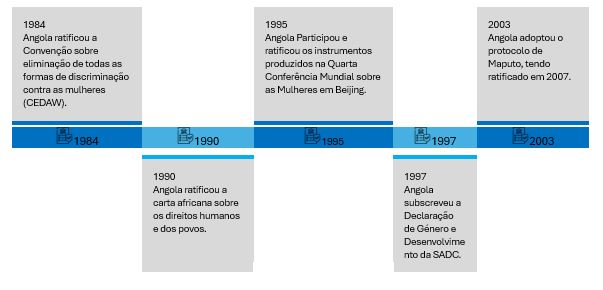 1997 – Angola subscreveu a Declaração de Género e Desenvolvimento da SADC, segundo a qual os Chefes de Estado e de Governo da SADC se comprometem a: Alcançar a meta de, pelo menos, 30 por cento de mulheres nas estruturas políticas e de tomada de decisão até 2005; promover o pleno acesso e controlo por parte das mulheres, sobre os recursos produtivos para reduzir o nível de pobreza entre as mulheres; revogar e reformar todas as leis, emendar constituições e mudar práticas sociais que ainda sujeitem as mulheres a discriminação; os Estados comprometem-se ainda em tomar medidas urgentes para prevenir e tratar dos níveis crescentes de violência contra as mulheres,
